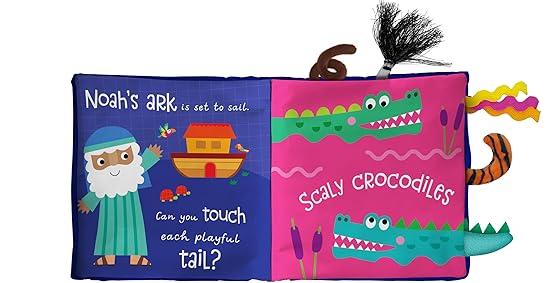 This delightful interactive cloth story book is fun, soft, and perfect for small hands! Meet the animal pairs as they climb aboard Noah's Ark and explore, tug and touch their tails which come in a range of textures, shapes, and colours. Accompanied by bright, colourful illustrations and surprise crinkles that stimulate hearing, the story of how God saved the animals on Noah's ark is told in a simple way that very young children can understand. With a Velcro strap to attach the book to your buggy or pram, Bible Tails is perfect for babies and toddlers to touch and squeeze while on the move! Bible Tails will help: * Babies and toddlers enjoy learning about Noah's Ark as they touch and feel their way through this tactile cloth story book * Share cute and vibrant illustrations that will entertain 0 - 2 years