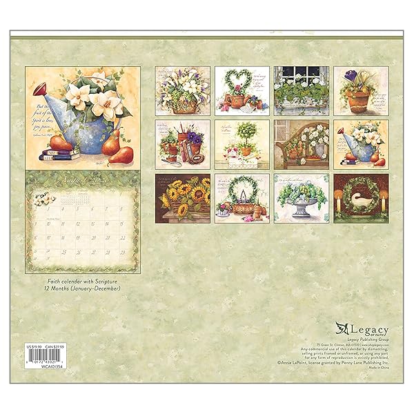 Nourish your soul with this 12-Month Wall Calendar spanning from January to December; Showcases a diverse collection of watercolor-style artwork depicting garden scenes floral arrangements, rustic elements, and gentle scripture verses; Each month offers a new and captivating illustration.