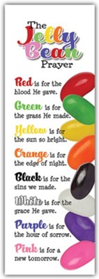Teach children about Jesus' resurrection with these creative bookmarks. The front features the text of The Jelly Bean Prayer with a colorful line of jelly beans down the right-hand side. The back includes lines for a personal message along with the text of Luke 24:34 (NIV): The Lord has risen.