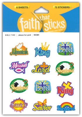 These Faith that Sticks ® stickers show favorite Christian symbols. Jesus is Lord features 12 different colorful stickers featuring a name of God along with a visual representation of the name (cross, crown, dove, sheep, shepherd's hook, ichthus symbol, sun, rainbow, butterfly). Use for attendance, scrapbooks, embellishing letters, and card enclosures. 6 sheets.
