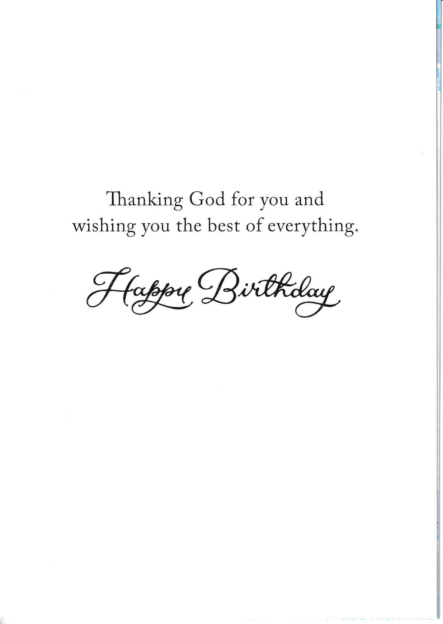 Card - Wishing you Happiness, Health, High Hope KJV ICM Price £1.69 RRP: £1.99 (Saving of 15%) ICM Price £1.69 RRP: £1.99 (Saving of 15%) Shipping is FREE for all UK orders over £20. (only £2.95 for UK orders under £20) Thanking God for you and wishing you the best of everything HAPPY BIRTHDAY With white envelope