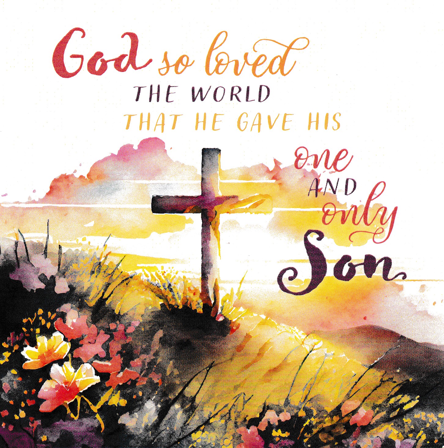 The front of the card features a watercolour hillside with a cross and the Bible verse John 3:16: "God so loved the world that he gave his one and only Son." Inside is the Bible verse John 3:16 (ESVUK): "For God so loved the world, that he gave his only Son, that whoever believes in him should not perish but have eternal life" - and the greeting "God bless you at Easter."