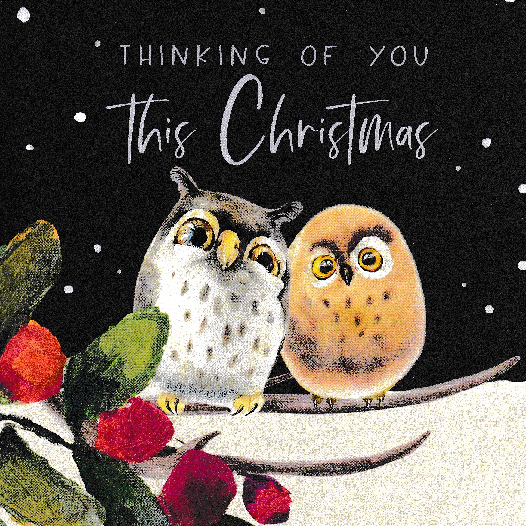 Card - Thinking of you This Christmas - Owls SDC ICM Price £2.20 RRP: £2.50 (Saving of 12%) ICM Price £2.20 RRP: £2.50 (Saving of 12%) Shipping is FREE for all UK orders over £20. (only £2.95 for UK orders under £20) Message Inside: May you feel deeply loved and truly blessed this Christmas. He shall cover thee with His feathers, and under His wings shalt thou trust Psalm 91:4 Size 15x15