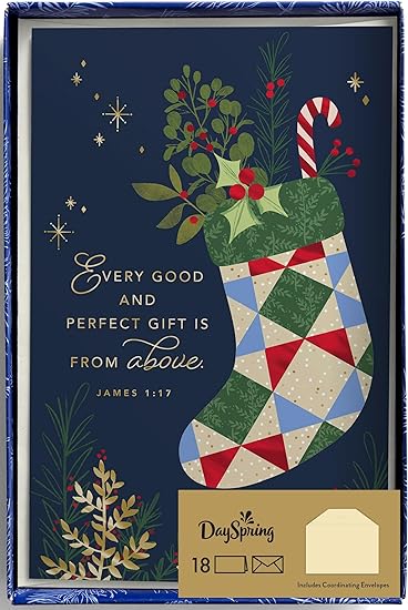 Wish friends and family Every Good and Perfect Gift this holiday season! These Christmas boxed cards are a wonderful reminder of the joy that the season brings. Featuring a sweetly stuffed stocking, red and gold foil accents, and Scripture, these cards are sure...