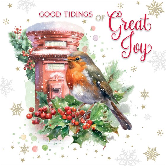 The front of the card features a robin sat on a holly branch in front of a postbox, and the wording “Good tidings of Great Joy.”