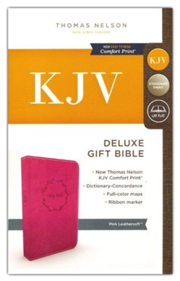 The KJV Deluxe Gift Bible is perfect for personal use or to give as a gift to celebrate special occasions like graduations, baptisms, birthdays, or achievements. This beautifully crafted Bible features Leathersoft covers, ribbon markers, and the new Thomas Nelson KJV Font. Additional features include a special presentation page, the words of Christ in red, full-color maps, charts, and an easy-to-use dictionary-concordance.