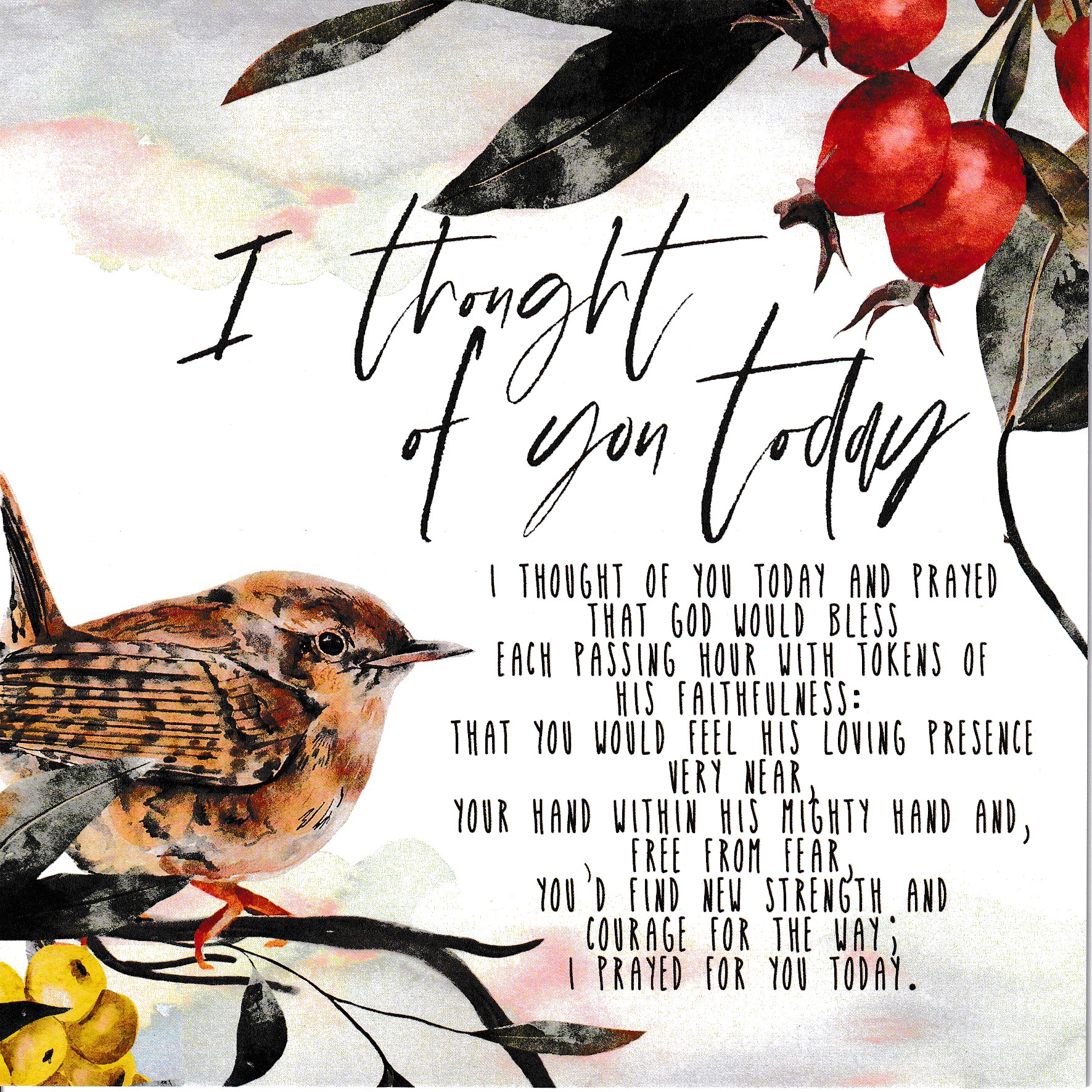 Card - I Thought Of You Today ICM Price £2.20 RRP: £2.50 (Saving of 12%) ICM Price £2.20 RRP: £2.50 (Saving of 12%) Shipping is FREE for all UK orders over £20. (only £2.95 for UK orders under £20) This unique little card, depicting a wren and some lovely foliage, shares a thoughtful poem, written by the artist, to help those in time of trouble. The inside of the card is blank and provides opportunity for a long, personal greeting.