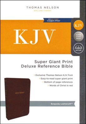 The KJV Deluxe Super Giant Print Reference Bible combines the literary beauty of the King James Version with the most comfortable reading experience imaginable using Nelson's custom KJV font in a super-giant-print text size. Don't miss anything God's Word has to offer with the KJV Super Giant Print Deluxe Reference Bible. With a generous type size, end-of-page references, a concordance, and words of Christ in red, this Bible is designed for readability and serious study.