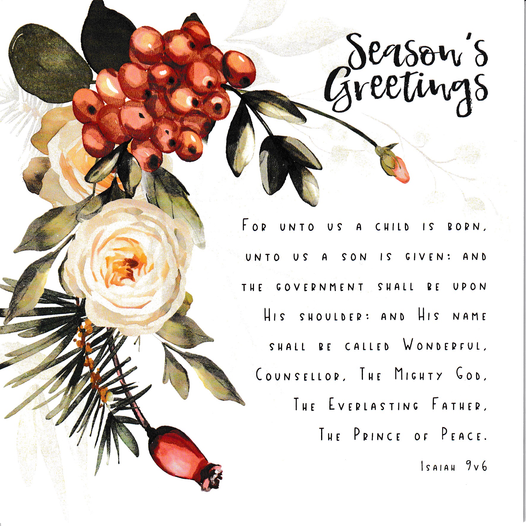 Christmas Card - Season's Greetings For Unto Us A Child - CMS ICM Price £2.20 RRP: £2.50 (Saving of 12%) ICM Price £2.20 RRP: £2.50 (Saving of 12%) Shipping is FREE for all UK orders over £20. (only £2.95 for UK orders under £20) Message Inside: With Season's Greetings and very best wishes Isaiah 9:6 Size 15 x 15