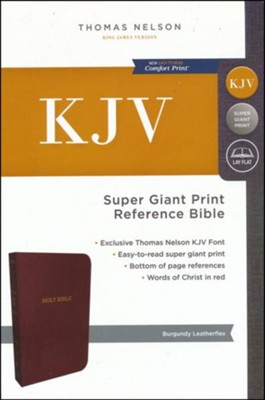 The literary beauty of the King James Version with the readability of Thomas Nelson's custom size 16 KJV font, plus essential study resources, words of Christ in red- that's the KJV Super Giant Print Reference Bible. The giant print format and beautifully designed layout of this edition will add to your comfort as you dig deep into God's Word. Additional features include an attractive end-of-page reference system, book introductions, a concordance, and full-color maps.