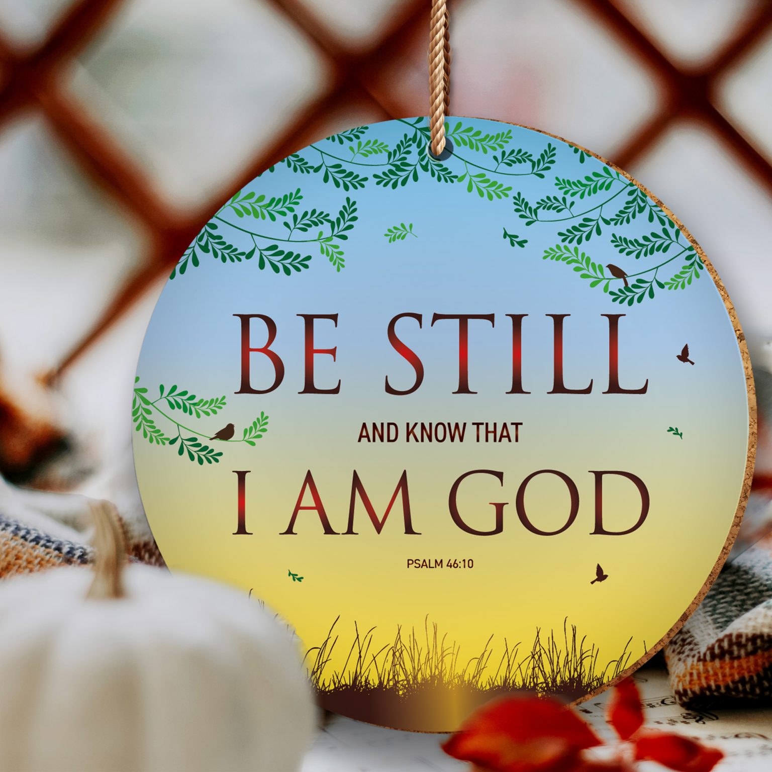 Wording on front: ‘Be still and know that I am God’.- Psalm 46:10