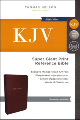 The literary beauty of the King James Version with the readability of Thomas Nelson's custom size 16 KJV font, plus essential study resources, words of Christ in red- that's the KJV Super Giant Print Reference Bible. The giant print format and beautifully designed layout of this edition will add to your comfort as you dig deep into God's Word. Additional features include an attractive end-of-page reference system, book introductions, a concordance, and full-color maps.